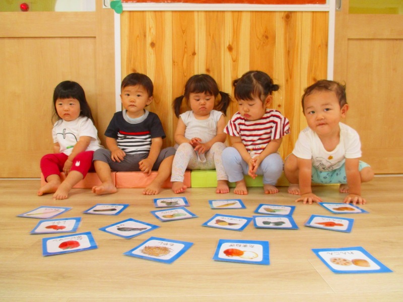 ほかにも、普段よく知っている食べ物(ごはんや魚、牛乳など)のカードをみながら名前を言ったり、「食べたことある人?」と聞くと「は~い!」と手を挙げたり♪