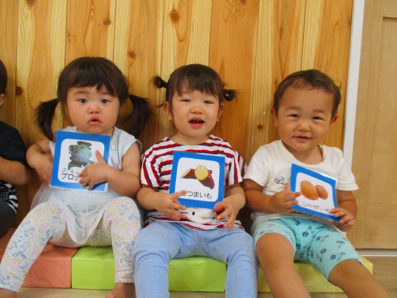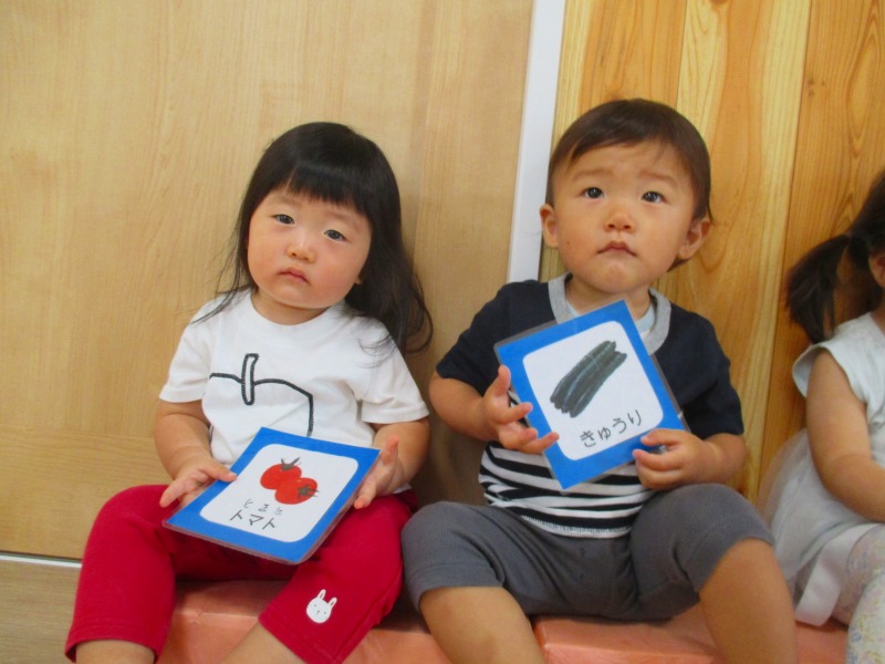 「野菜の仲間だよ!」と伝えると「〇〇!」と分かる野菜のカードを指差ししていた子どもたち。