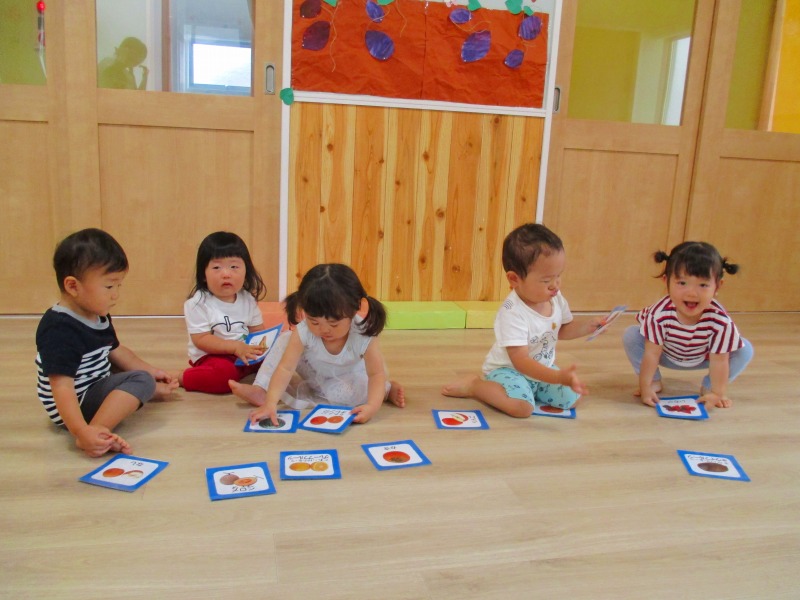 食欲の秋(*^▽^*)ということで、食べ物に興味が持てるように食べ物の写真入りカードを使って遊んでみましたよ(^O^)/