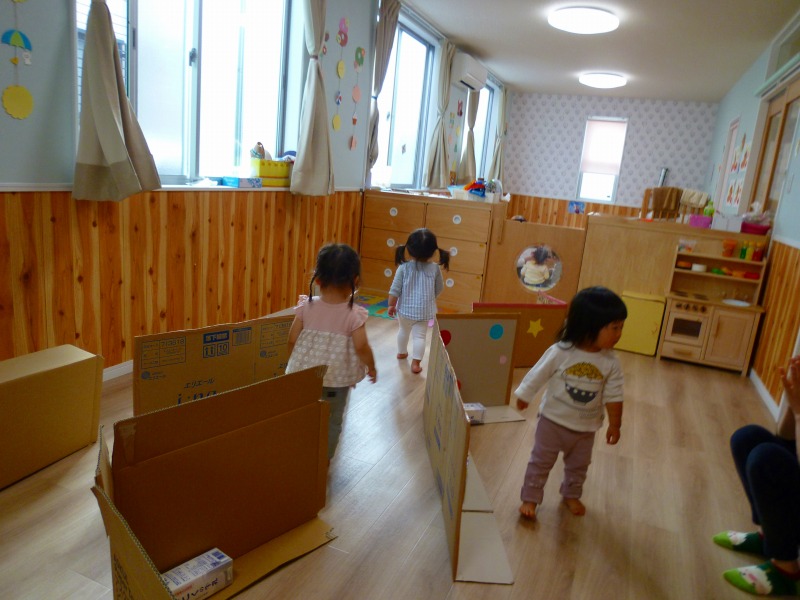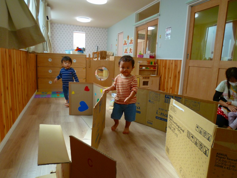 最近、段ボール遊びが楽しいようで・・・こんな遊びをしてみました(*^-^*)