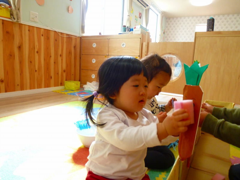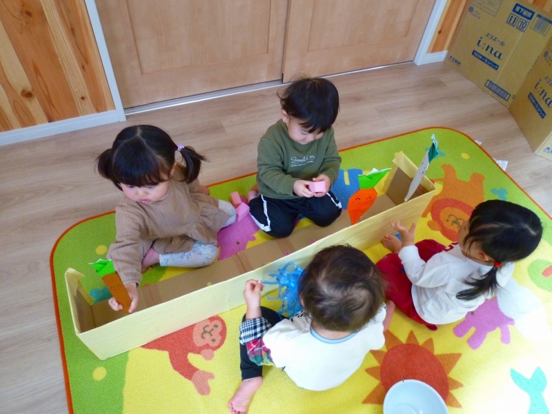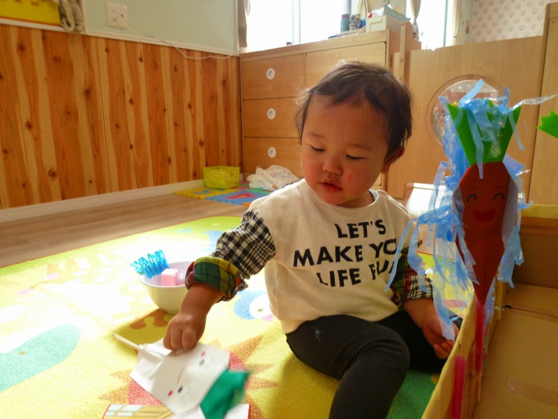 それぞれお気に入りの野菜を使ったり、保育士の話に合わせて動かしながら遊ぶ姿が見られていました(^O^)/