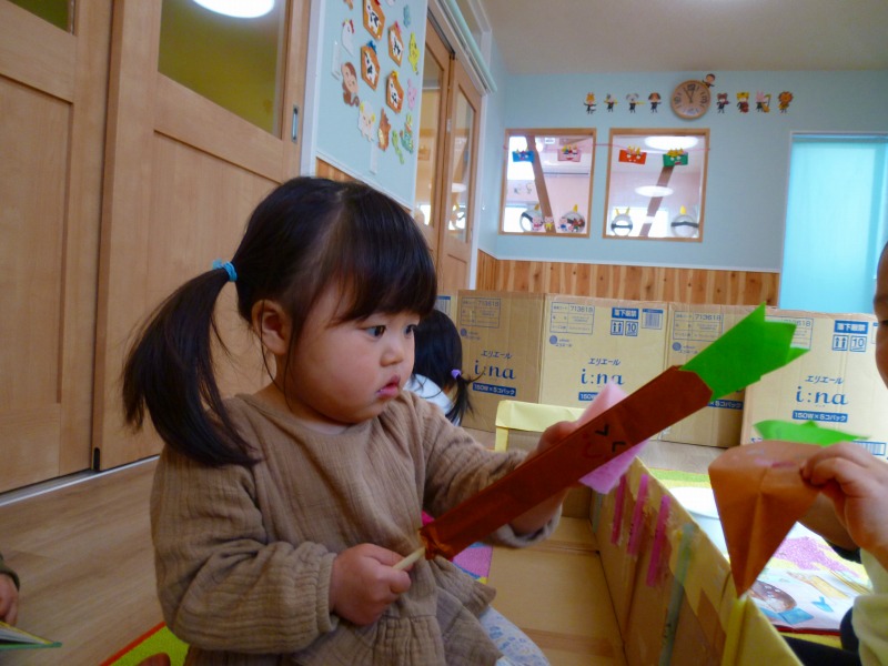 最近、お気に入りの“にんじん だいこん ごぼう”という絵本に親しみながら、『ペープサート』を使って遊んでみましたよ♫