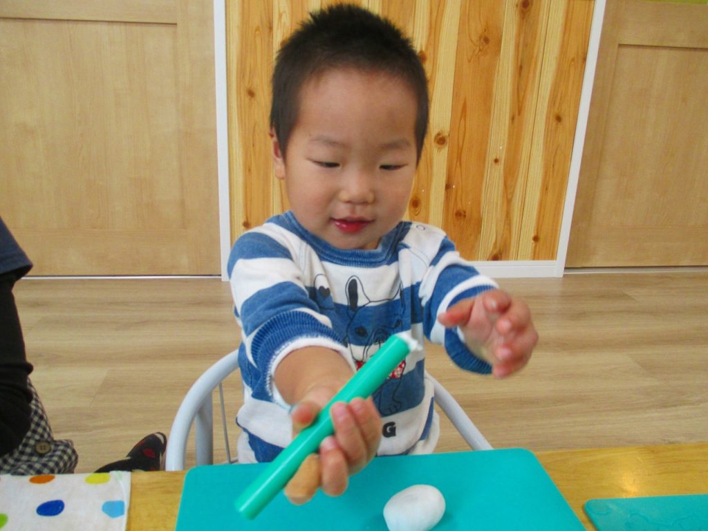 まずは道具を使ってぺったんぺったん!お餅つきみたい(*^-^*)
